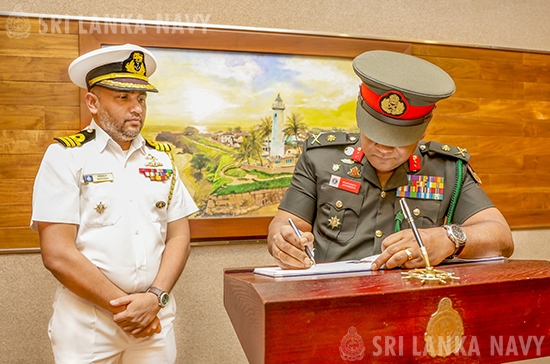 සපුගස්කන්ද, ආරක්ෂක සේවා අණ හා මාණ්ඩලික විද්යායතනයේ අභිනව ආඥාපති ලෙස පත්වූ, මේජර් ජෙනරාල් විජයනාත් ජයවීර අද (2026 ජනවාරි 09) නාවික හමුදා මූලස්ථානයේදී, නිල හමුවක් සඳහා නාවික හමුදාධිපති වයිස් අද්මිරාල් කාන්චන බානගොඩ හමුවිය.