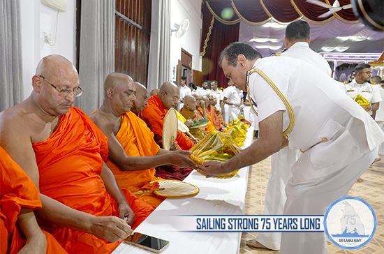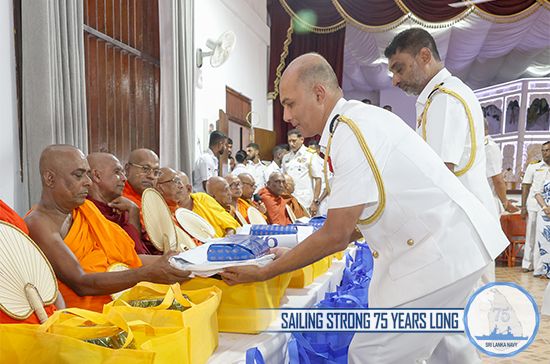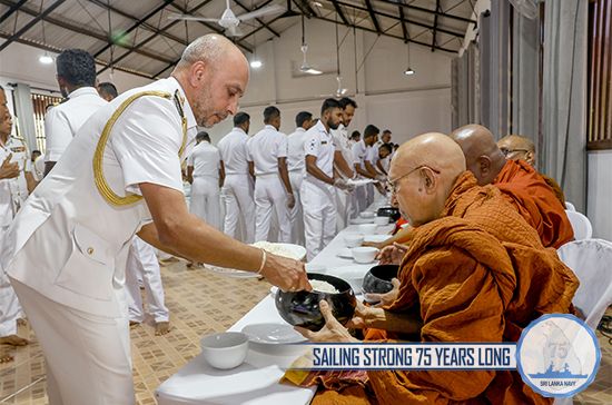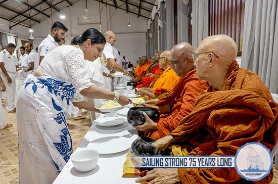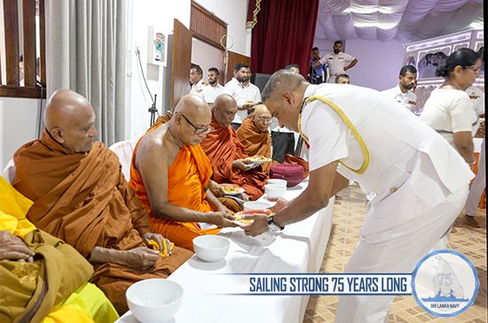 Further, offering of mid-day alms and Pirikara to 75 members of Maha Sangha, arrived from Mulagandhakuti Viharaya, were held at the Welisara Naval Complex on 07 December. Following the alms giving ceremony, Ven. Maha Sangha transferred merits on fallen naval war veterans and blessings were invoked on disabled naval war heroes, Commander of the Navy, naval personnel both serving and retired, their family members and the Navy, for its 75th anniversary as well as on those affected by recent adverse weather.