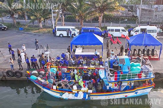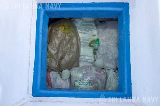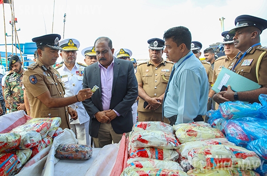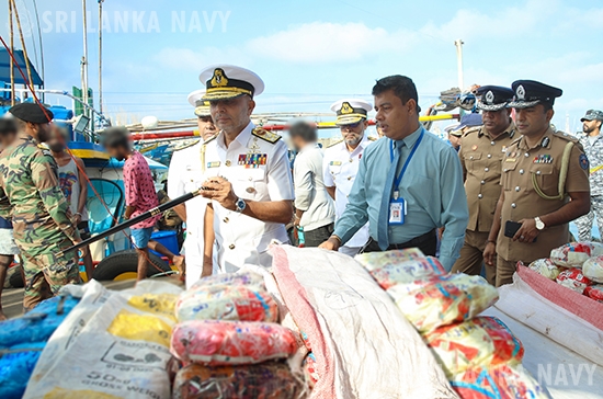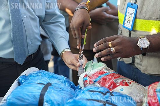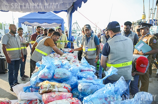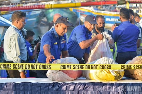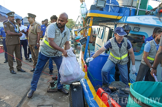 නාවික හමුදාව, ශ්රී ලංකාවට දකුණු දිග ගැඹුරු මුහුදේ සිදුකල විශේෂ නාවික මෙහෙයුමකදී, විෂ මත්ද්රව්ය අඩංගු බවට සැකකෙරෙන උර එකොලහක් (11) ප්රවාහනය කරමින් තිබූ දේශීය බහුදින ධීවර යාත්රාවක් සමඟ සැකකරුවන් පස් දෙනෙකු (05) නාවික හමුදා භාරයට ගැනීමට කටයුතු කෙරිණි. එම බහුදින ධීවර යාත්රාව සහ සැකකරුවන් අද උදෑසන (2025 දෙසැම්බර් 24) දික්ඕවිට ධීවර වරාය වෙත රැගෙනවිත් පොලිස් මත්ද්රව්ය නාශක කාර්යංශය විසින් සිදුකල විශේෂඥ පරීක්ෂාවේදී, එම උර තුල අයිස් මත්ද්රව්ය කිලෝග්රෑම් එකසිය හැත්තෑ දෙකකට (172) අධික තොගයක් සහ හෙරොයින් මත්ද්රව්ය කිලෝග්රෑම් විසි එකකට (21) කට අධික තොගයක් ඇති බවට තහවුරු විය. එම මත්ද්රව්ය තොගය නිරීක්ෂණය සඳහා ගරු ආරක්ෂක නියෝජ්ය අමාත්ය මේජර් ජෙනරාල් අරුණ ජයසේකර (විශ්රාමික) සහ නාවික හමුදාධිපති වයිස් අද්මිරාල් කාන්චන බානගොඩ සහභාගී වූ අතර, එම අවස්ථාව සඳහා ශ්රී ලංකා පොලිස්පති ප්රියන්ත වීරසූරිය මහතාද එක්විය.