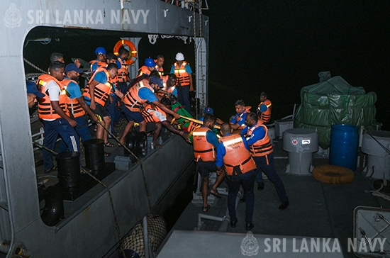 2025 டிசம்பர் 25, அன்று, காலி மீன்பிடித் துறைமுகத்தைச் சேர்ந்த ஏழு (07) மீனவர்களை ஏற்றிச் சென்ற பல நாள் மீன்பிடிக் கப்பலான ‘சினுஷ’ (IMUL-A-2195GLE) இலங்கைக்கு தெற்கே நானூற்று எழுபத்து நான்கு (474) கடல் மைல் தொலைவில் உள்ள ஆழ்கடலில் மீன்பிடி நடவடிக்கைகளில் ஈடுபட்டிருந்தபோது, அதில் இருந்த மீனவர்களில் ஒருவர் கடுமையான மார்பு வலி காரணமாக மிகவும் மோசமாக நோய்வாய்ப்பட்டார். கடற்படை தலைமையகத்தை அன்மித்த கொழும்பு கடல்சார் தேடல் மற்றும் மீட்பு ஒருங்கிணைப்பு மையத்திடம், மீனவரை சிகிச்சைக்காக கரைக்கு கொண்டு வருவதற்கு உதவி வழங்குமாறு மீன்வள மற்றும் நீர்வளத் துறை விடுத்த கோரிக்கைக்கு கடற்படை உடனடியாக பதிலளித்ததுடன், கடற்படையினர் நோயாளிக்கு தேவையான மருத்துவ ஆலோசனைகளை (Tele Therapy) தொலைபேசி மூலம் வழங்கி, நோயாளியை அருகிலுள்ள மீன்பிடி துறைமுகத்திற்கு அழைத்து வருமாறு அவருக்குத் தெரிவித்தனர், மேலும் நோயாளியை விரைவாக தரைக்குக் கொண்டு வர தெற்கு கடற்படை கட்டளைக்குச் சொந்தமான ஒரு படகொன்றை கடல் பகுதிக்கு அனுப்பினர்.
