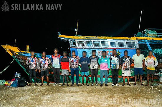 அதன்படி, 2026 ஏப்ரல் 11 ஆம் திகதி இரவு, யாழ்ப்பாணத்தில் உள்ள காரைநகர் கோவிளம் பகுதிக்கு அருகிலுள்ள உள்ளூர் கடற்பகுதிக்குள் நுழைந்து சட்டவிரோத மீன்பிடி நடவடிக்கைகளில் ஈடுபட்டிருந்த பல இந்திய மீன்பிடிப் படகுகளை வடக்கு கடற்படை கட்டளைப்பிரிவு கண்டறிந்தது. அதனைத் தொடர்ந்து, வடக்கு கடற்படை கட்டளைப்பிரிவுக்குச் சொந்தமான படகை பயன்படுத்தி, அந்த மீன்பிடிப் படகுகளை இலங்கை கடற்பரப்பிலிருந்து அகற்றுவதற்காக ஒரு சிறப்பு நடவடிக்கை மேற்கொள்ளப்பட்டது.அப்போது, உள்ளூர் கடல் எல்லைக்குள் சட்டவிரோத மீன்பிடி நடவடிக்கைகளில் தொடர்ந்து ஈடுபட்டிருந்த ஒரு இந்திய மீன்பிடிப் படகை (01) இலங்கை கடற்படை சட்டப்பூர்வமாக ஏறி ஆய்வு செய்ததுடன், மேலும் எல்லைச் சட்டங்களை மீறி சட்டவிரோத மீன்பிடி நடவடிக்கைகளில் ஈடுபட்டிருந்த அந்த இந்திய மீன்பிடிக் படகுடன் (01) பன்னிரண்டு (12) இந்திய மீனாவார்களையும் கடற்படையினர் கைப்பற்றினார்.