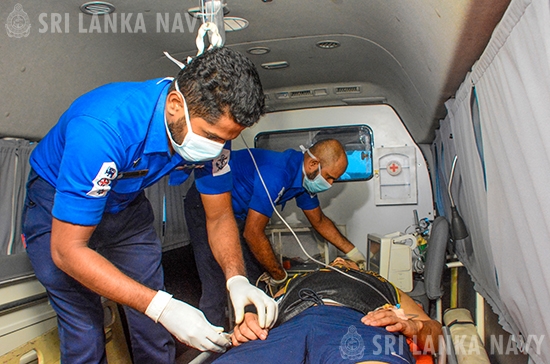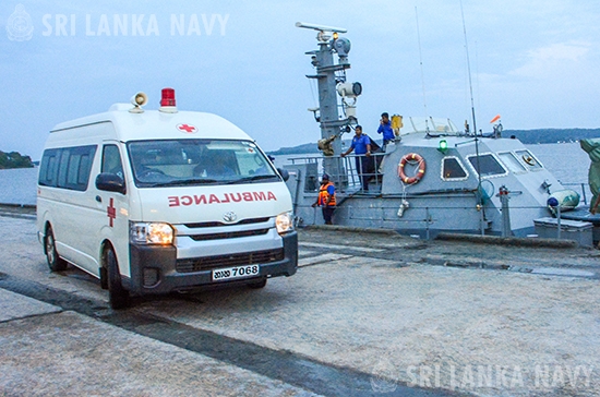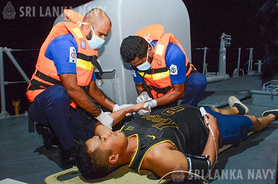 Subsequently, initial first aid was administered to stabilize the patient and facilitated his transfer. Having brought him to Trincomalee Harbour, the patient was rushed to the Trincomalee General Hospital for further treatment.