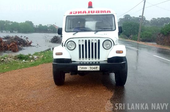 Responding to an urgent request from the Velani Divisional Secretariat, a Navy medical team deployed via ambulance. The team provided immediate first aid to the patient, who was isolated due to inundated access roads, and safely transported her to Punguduthivu Hospital for medical attention.
