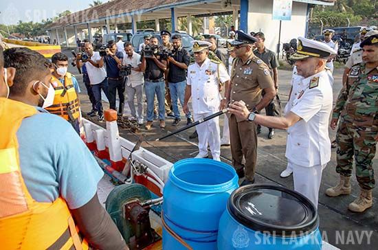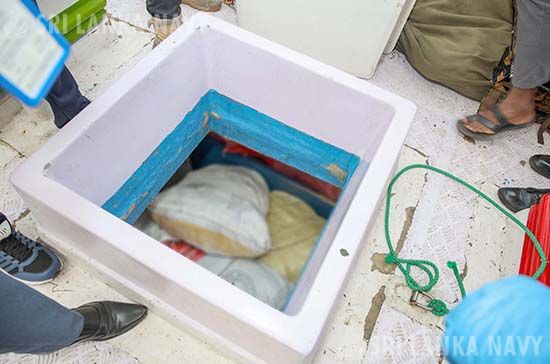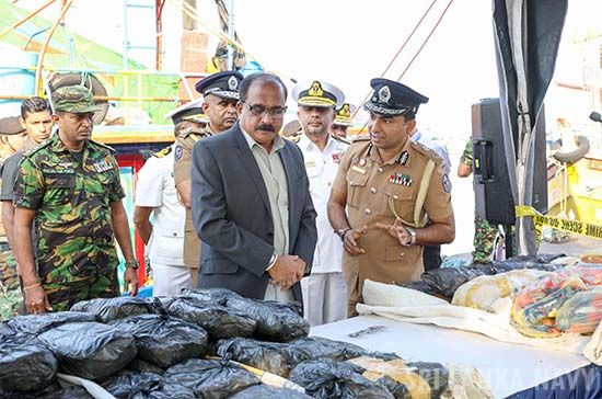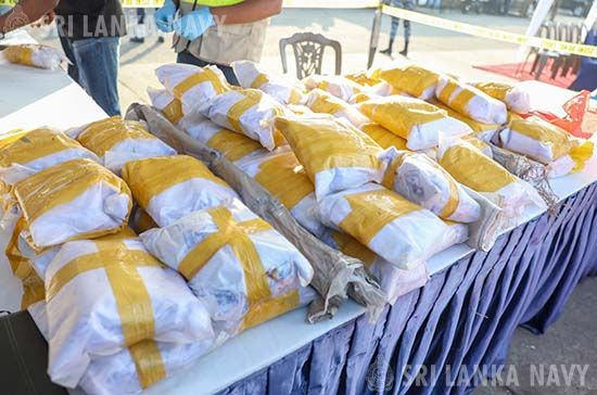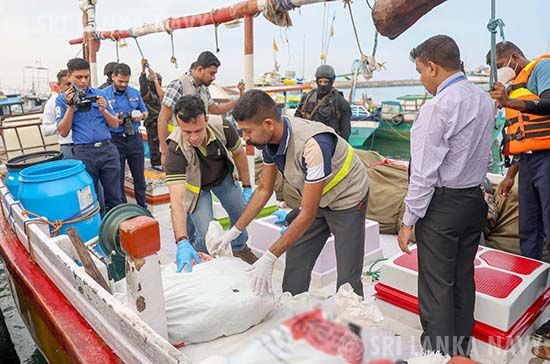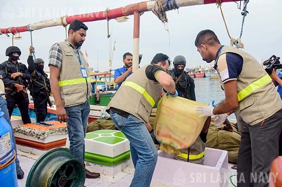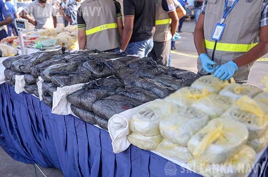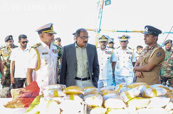 This morning (25 Jan 26), the two intercepted fishing trawlers, along with fourteen (14) sacks laden with suspected narcotics and the suspects, were brought to the Dikovita Fisheries Harbour. An expert examination by the Police Narcotic Bureau confirmed that the fourteen (14) sacks contained more than 184 kilograms of heroin and over 112 kilograms of 'Ice' (crystal methamphetamine). The Deputy Minister of Defence, Major General (Retd) Aruna Jayasekara, and the Commander of the Navy, Vice Admiral Kanchana Banagoda, inspected the seized narcotics in Dikovita. The Inspector General of Police, Mr. Priyantha Weerasuriya, also attended the inspection.