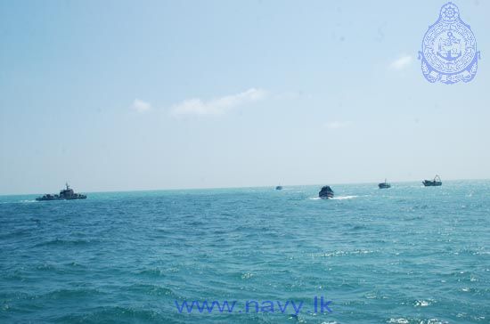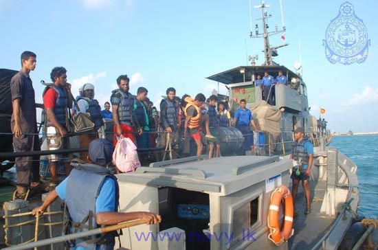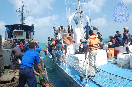 Sri Lanka Navy assisted in the exchange of the second batch of Indian and Sri Lanka fishermen released in accordance with the discussions between the two governments. Seventy-one Indian fishermen with fifteen fishing boats were handed over to the Indian Coast Guard Ship “Samudra Paharedar” at the International Maritime Boundary Line off Kankasanthurei on 24th January 2014. Fifty-nine Sri Lankan fishermen with four fishing boats were taken over from the Indian authorities in exchange.