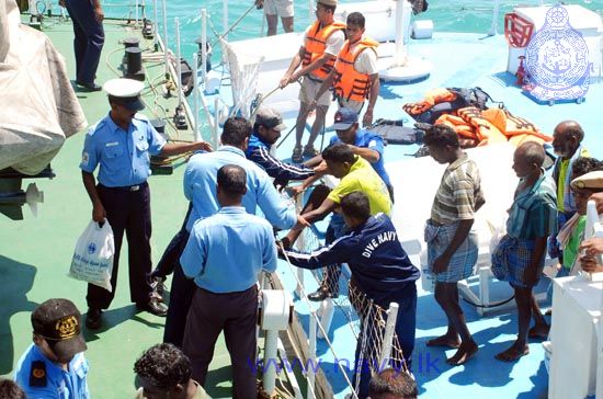 Sri Lanka Navy assisted the repatriation of 36 Indian fishermen on 11th June 2014. The fishermen were handed over to the Indian Coast Guard Ship “Raj Kamal” at the International Maritime Boundary Line off Kankasanthurei. Naval patrol craft attached to the Northern Naval Command were deployed for the humanitarian mission.