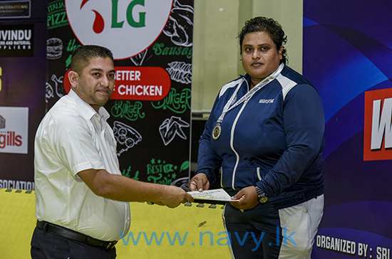 එමෙන්ම, කිලෝ ග්රෑම් 76 සහ 87 ට වැඩි බර පංති යටතේ පිළිවෙලින් තරඟ වැදුනු සාමාන්ය කාන්තා නැවි එස්එස් කුමාරසිංහ සහ සාමාන්ය කාන්තා නැවි ඩීඑම්එච්පී දිසානායක විසින් රිදී පදක්කම් දිනාගත් අතර, කිලෝ ග්රෑම් 87 බර පංතිය යටතේ තරඟ වැදුනු සාමාන්ය කාන්තා නැවි එච්එන්කේ ප්රනාන්දු විසින් ලෝකඩ පදක්කමක් දිනාගැනීමට සමත් විය.